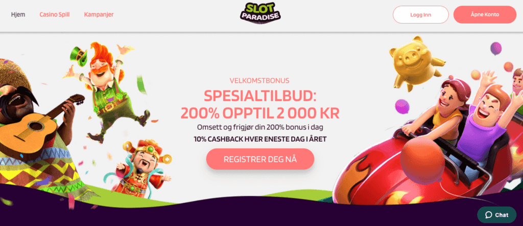 Slotparadise lokker med en flott velkomstbonus på 200%Hos Slotparadise kan du glede deg over morsom spillunderholdning på casino med en ekstra god velkomstbonus på 200% opptil 10 000 kr. Velg dine favorittspill og prøv lykken nå!