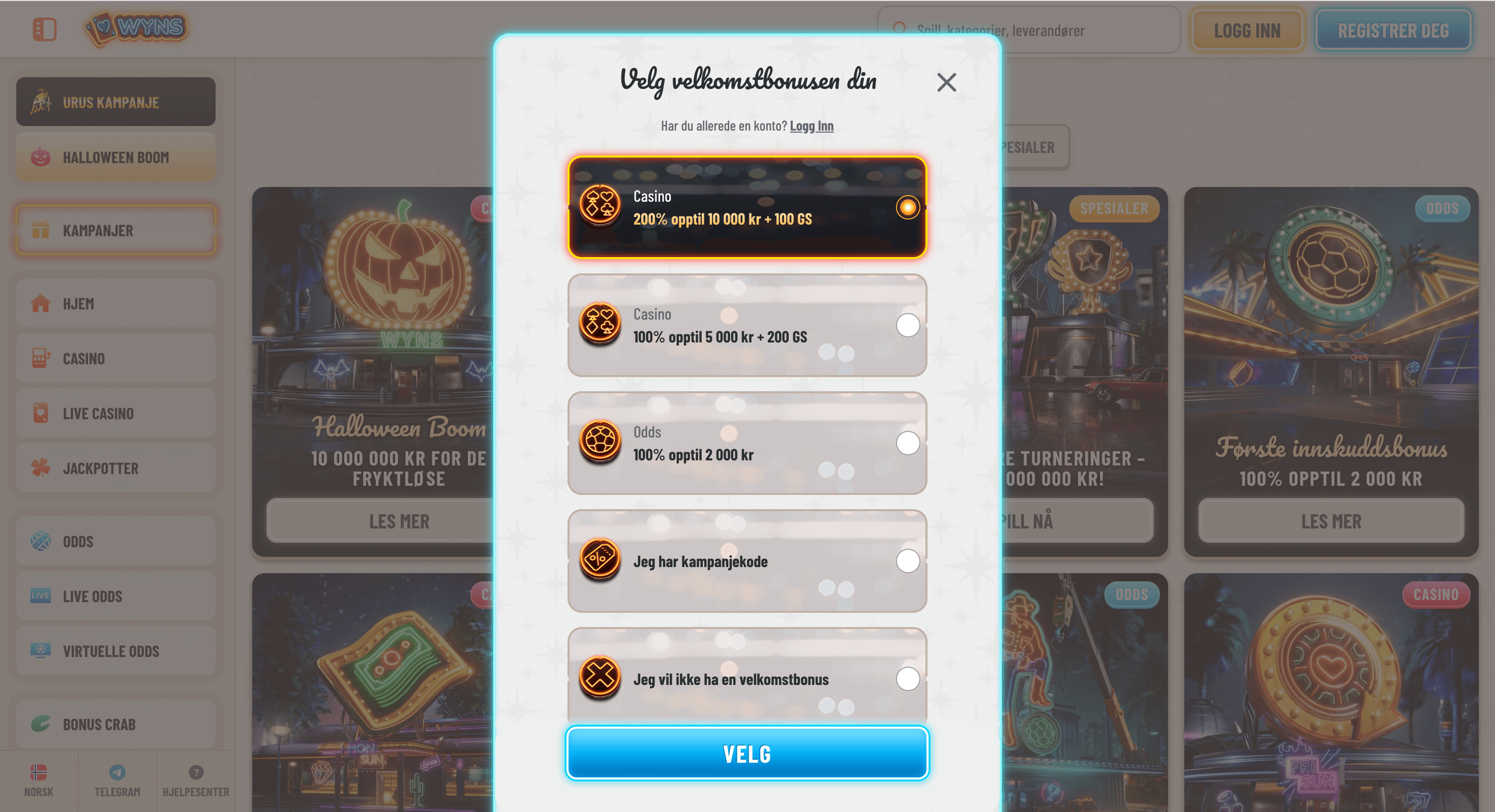 Akkurat nå får du en eksklusiv velkomstbonus hos Wyns gjennom NorgeKasino. Følg lenken i denne anmeldelsen, registrer deg hos casinoet, og bonusen vil være klar til bruk.