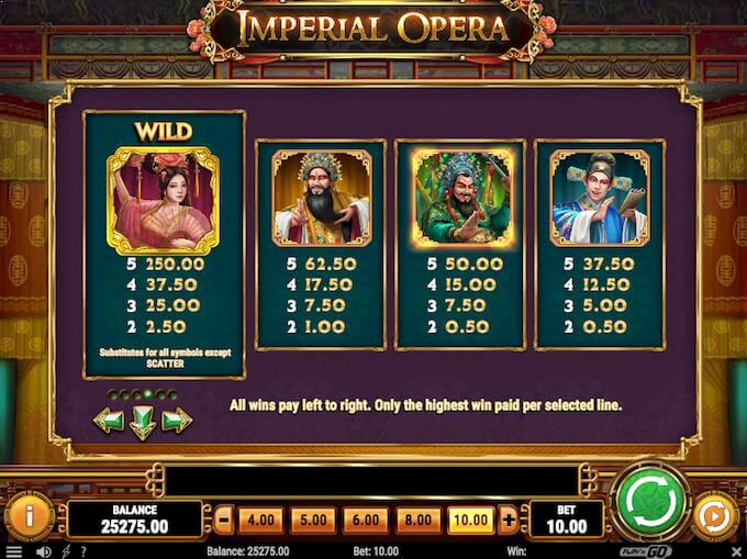 Når du spiller Imperial Opera vil du ha ulike verdier på symbolene. Det er bildesymbolene med personene som er de høytbetalende symbolene mens A til 10 er de lavtbetalende. I tillegg til dette er det megasymboler som kan dukke opp på skjermen. Her kan man blant annet få et stort free spins-symbol som aktiverer free spins.