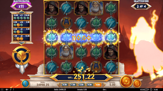 Det er også en annen funksjon i Rise of Olympus som kalles for The Wrath of Olympus-funksjonen. Dette aktiveres når måleren til høyre er fylt opp. Denne måleren fylles når du får vinnende kombinasjoner som inneholder et av gudssymbolene. Det har ikke noe å si om wild-symbolet er inkludert i en slik kombinasjon, det viktigste er at en av gudene er en del av den vinnende kombinasjonen.